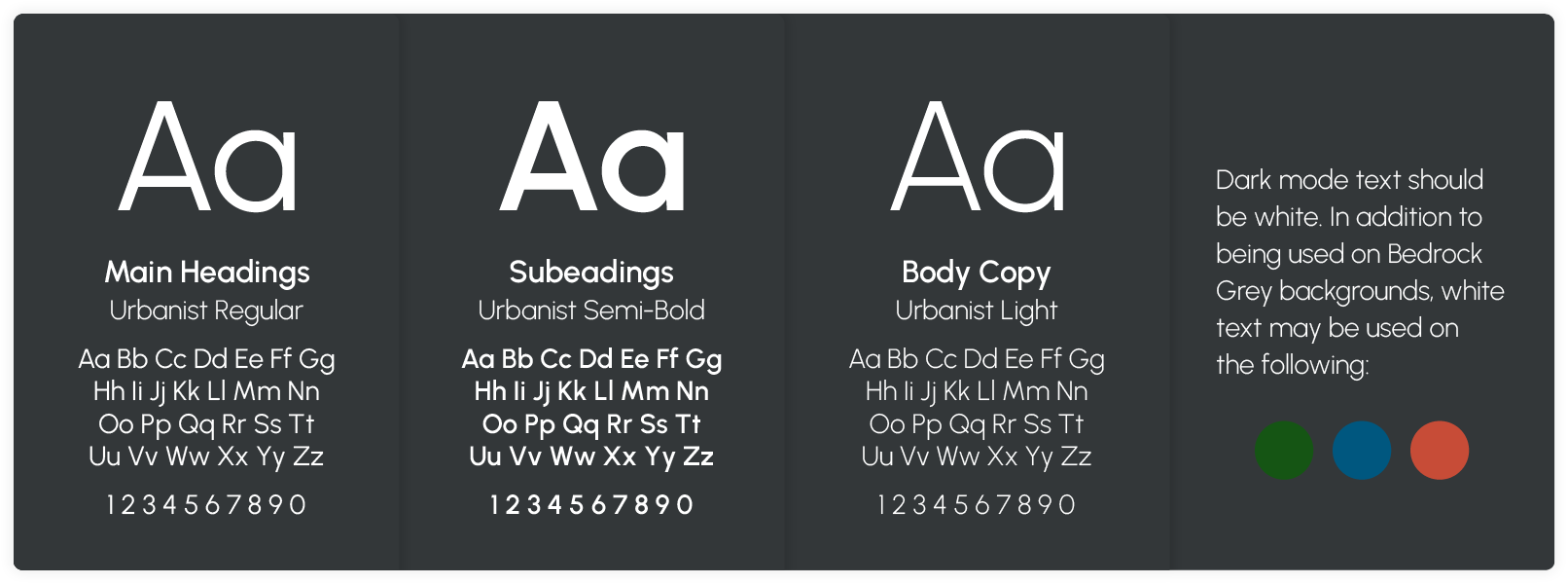 Dark mode text should be white. In addition to being used on Bedrock Grey backgrounds, white text may be used on Pine Green, Lake Blue, and Cosmos Red.