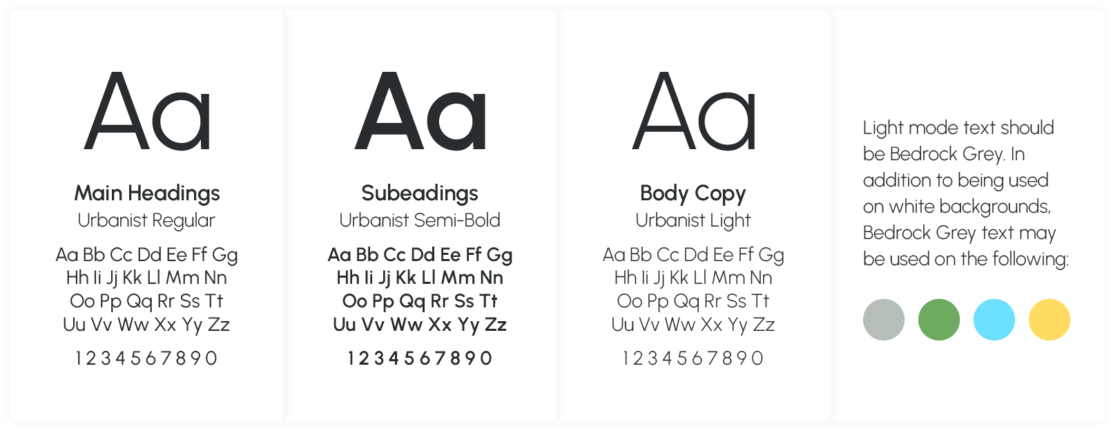 Light mode text should be Bedrock Grey/black. In addition to being used on white backgrounds, Bedrock Grey/black text may be used on Boulder Grey, Moss Green, Sky Blue, and Dhalia Yellow.