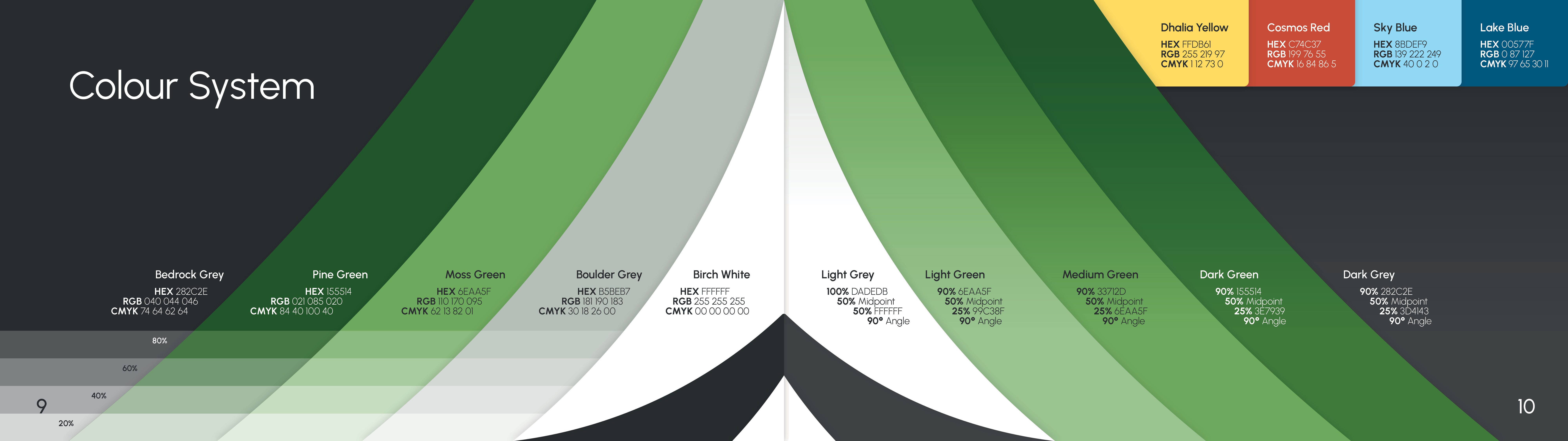 Bedrock Grey and Pine Green are the brand’s primary colours, with Moss Green, Boulder Grey, and Birch White being its secondary colours. The brand’s tertiary colours – Dhalia Yellow, Cosmos Red, Sky Blue, and Lake Blue – are to be used sparingly to highlight important information.