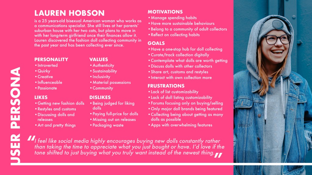The research statement this project aims to answer is as follows: How might we foster more conscious collecting behaviours in the fashion doll collecting community?