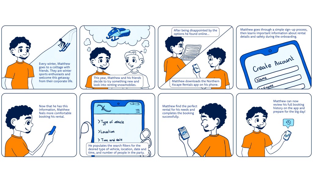 For this case study, I assessed the current sport vehicle rentals’ market and used my research insights to design an app to replace Northern Xscape Rentals’, a fictional company specializing in snowmobiles and jet skis rentals in three locations across Ontario, outdated website. In addition, I also designed the brand’s logo and visual identity.